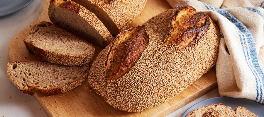 This wonderfully nutty hearth bread has sesame seeds in the dough and all over the exterior. Slice it thick, spread it with peanut butter and top with bananas for a superlative morning snack, or use it for a fortifying open-faced sandwich.