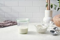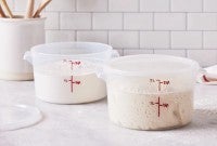 If you want to feed and store your sourdough starter in the same container, you want one that’s large enough to hold triple your volume of starter, to allow room for it to grow. It’s handy to use a clear glass or translucent plastic container, so you can track its progress. (Our glass sourdough crock is a preferred option.) Stoneware, plastic, stainless steel, and enameled metal are also suitable materials. Read more.